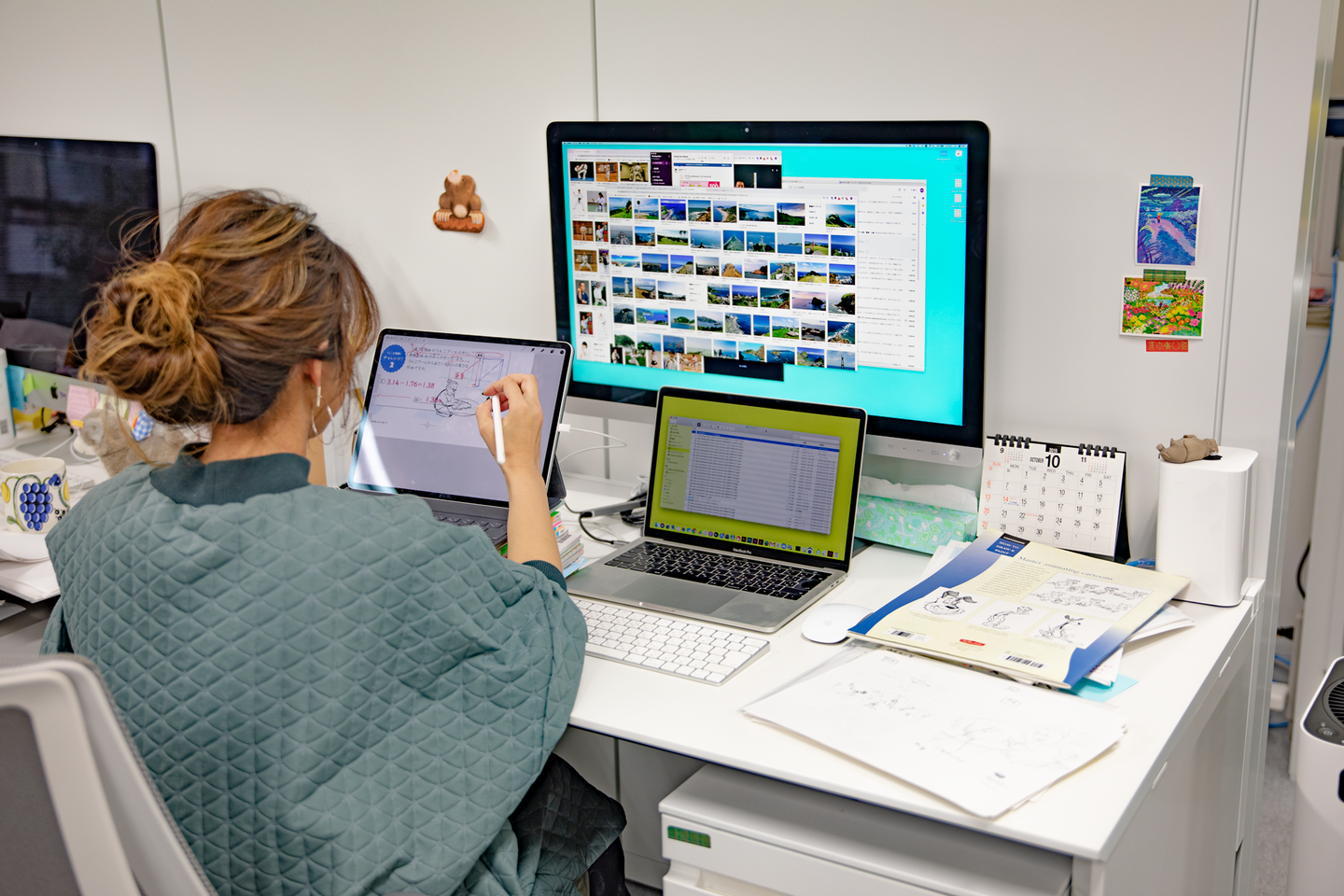 会社に属するとつくるものとの距離がぐっと縮まるので「もっとこうしたらイラストもデザインも良くなるのではないか」と思えばそれを提案できる機会もたくさんあります。前向きに仕事ができる部分がとても多いです。