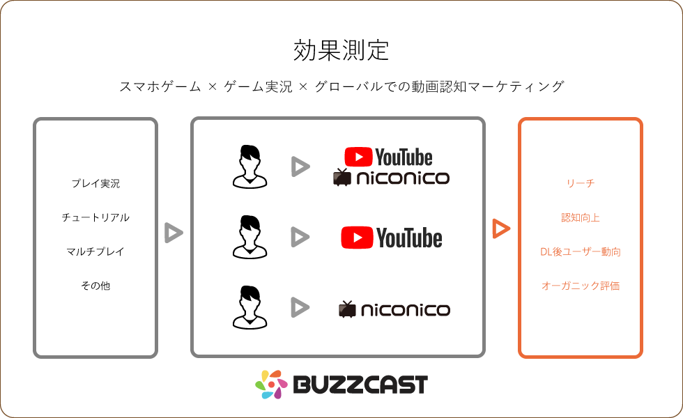 『BUZZCAST』は、ゲーム実況動画の効果を測定・可視化するプロダクトです。国内外の様々なゲーム実況者をネットワーク化し、広告主に最も相性の良い実況者をデータに基づき選定し、動画を通してサービスの魅力を伝えるプロモーションを実施しています。