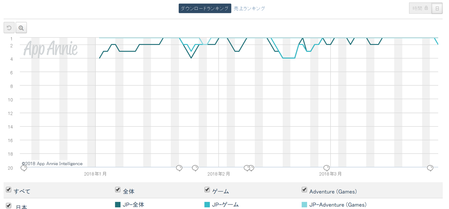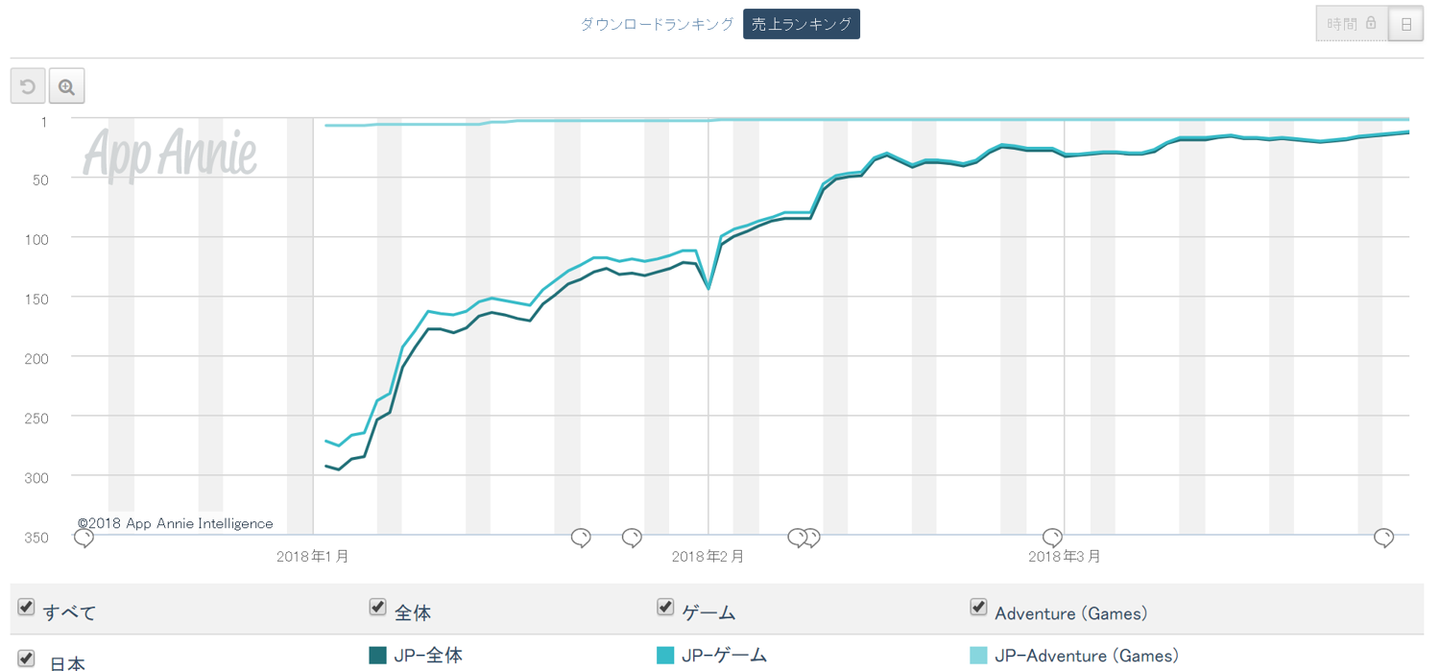 いつものようにAppAnnieさんの数値を引用させていただき、DL数推移、セールスランクを見ます。