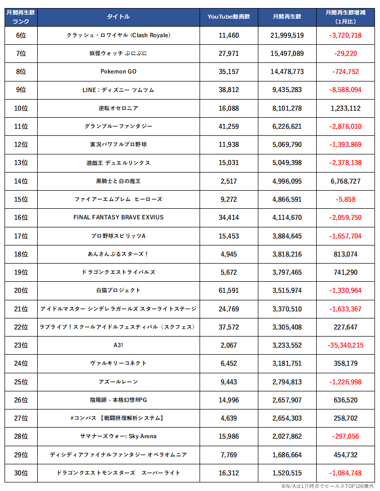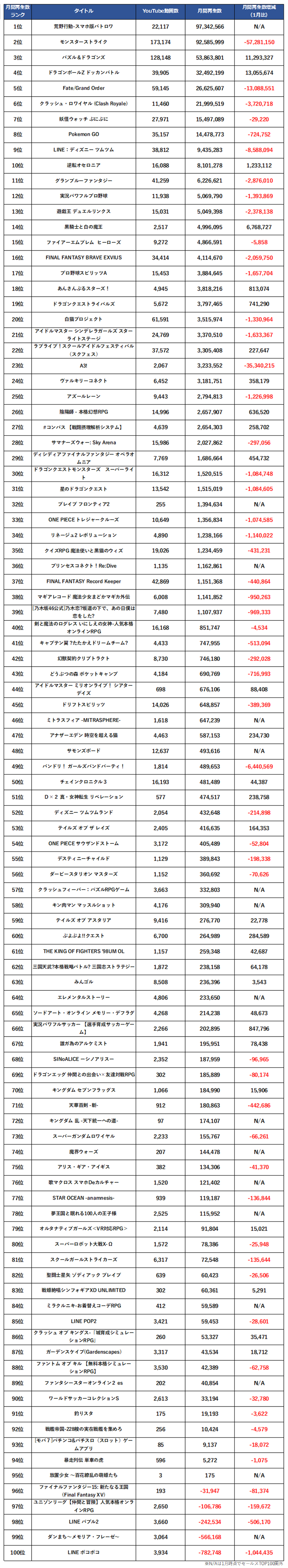 スマホゲーム100位までの動画再生数ランキングデータも下記にまとめましたので、ご覧いただければと思います。