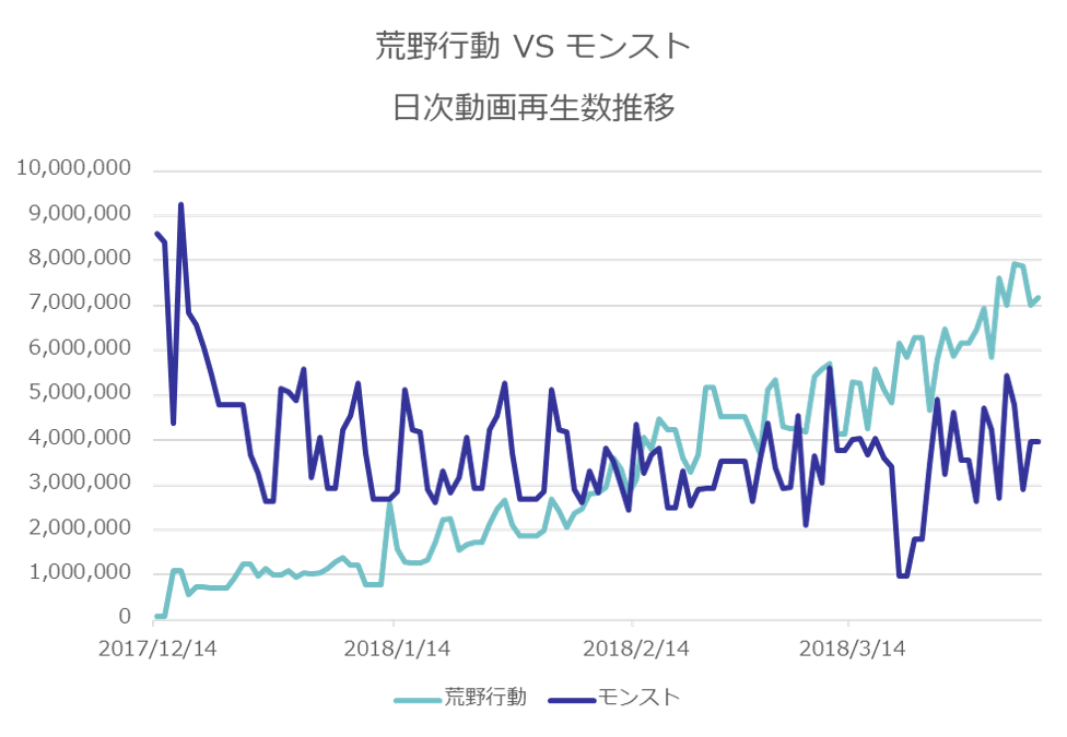 日次動画再生数の比較ですが、2月中旬を境に逆転!荒野行動はさらに上昇する勢いです。