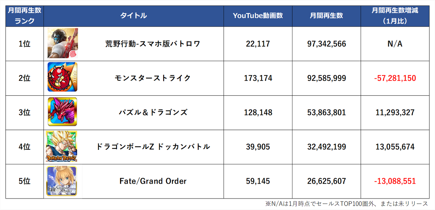 モンストの再生数規模を超えてきた荒野行動、ゲーム系YouTube動画コンテンツの視聴認知が高まってる、