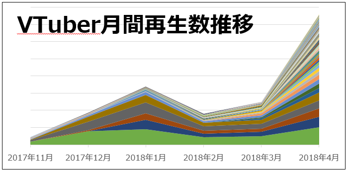 続いてVTuberチャンネルの月間再生数推移を調査してみました所、興味深いデータが確認できました。