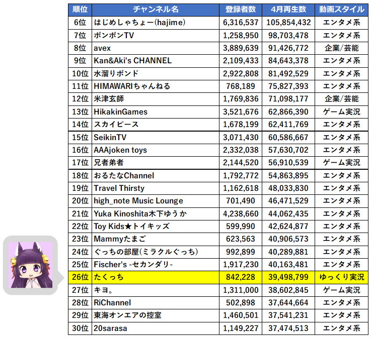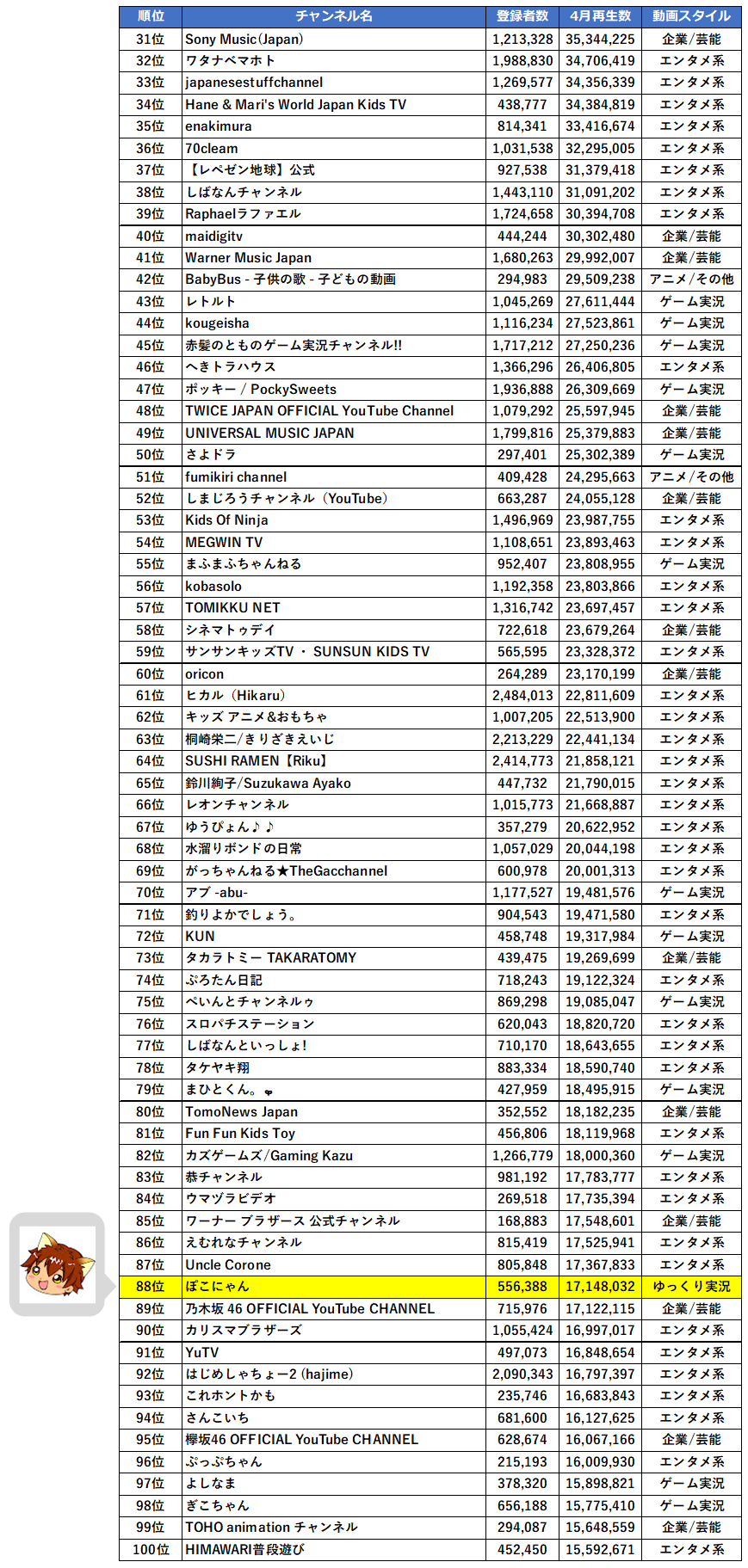 下記サイトをにて、YouTubeチャンネルの数値を”月間再生数”という観点で調査いたしました。