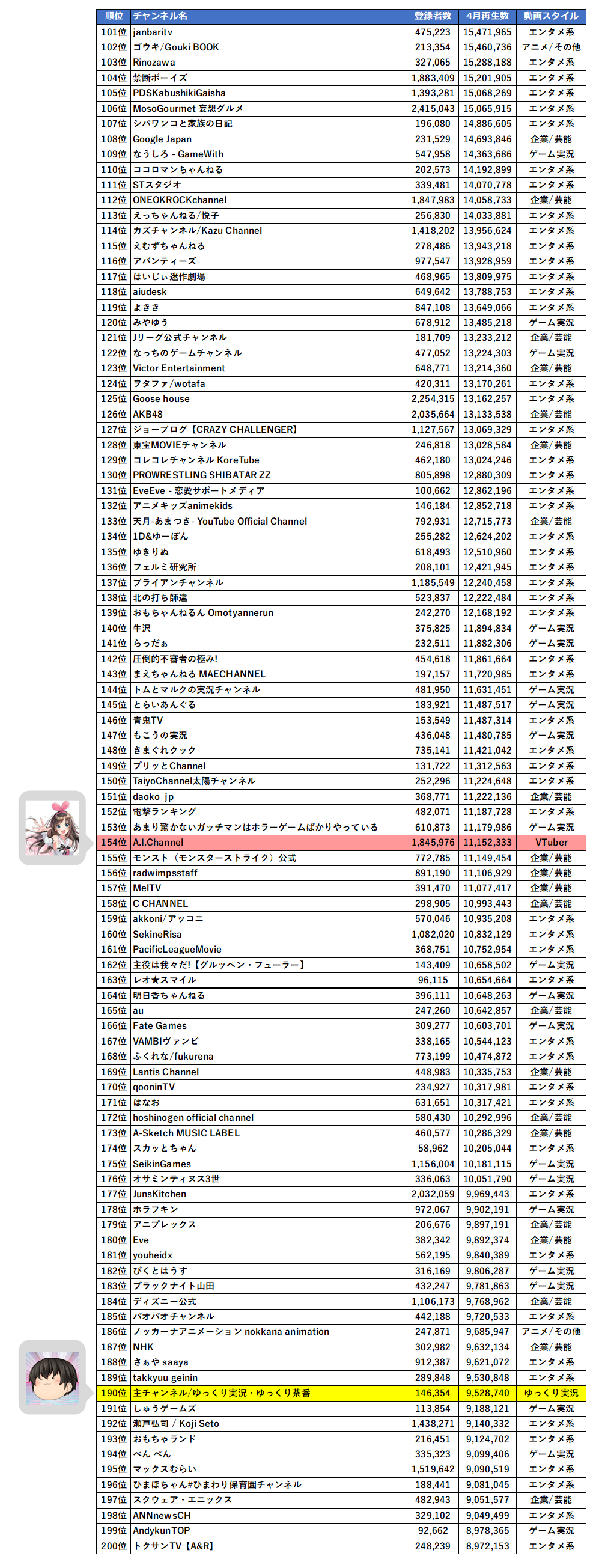 200位までを調べた所、154位に”A.IChannel”がランクインしていました。