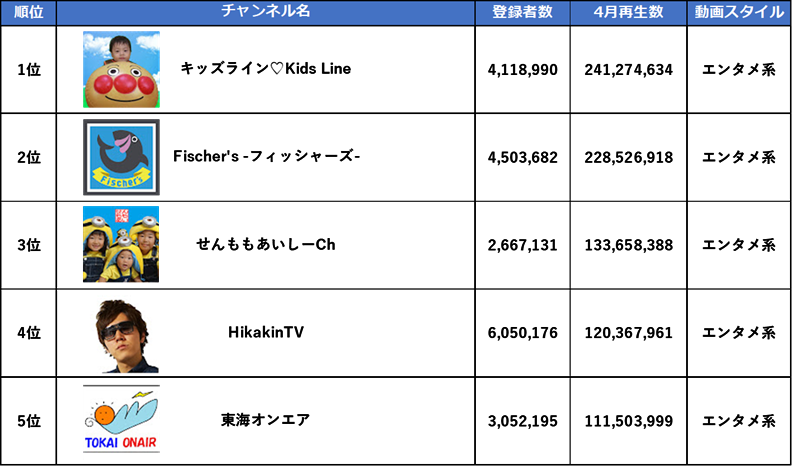 フィッシャーズさんがHikakinさんの再生数を超えたとは認識していましたが、、1位はキッズラインチャンネルとは驚きでした。