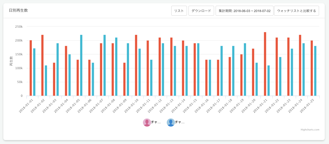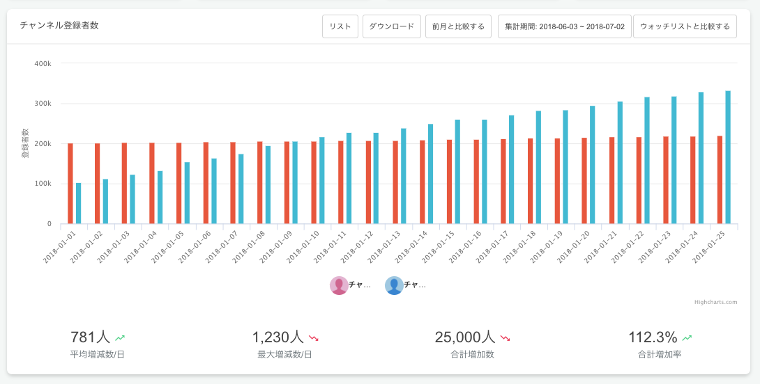 現時点での規模の比較も当然ながらできますが、チャンネル登録者数の比較、再生数などを、チャンネル開設から同期間で比較したりすることも可能になっています。