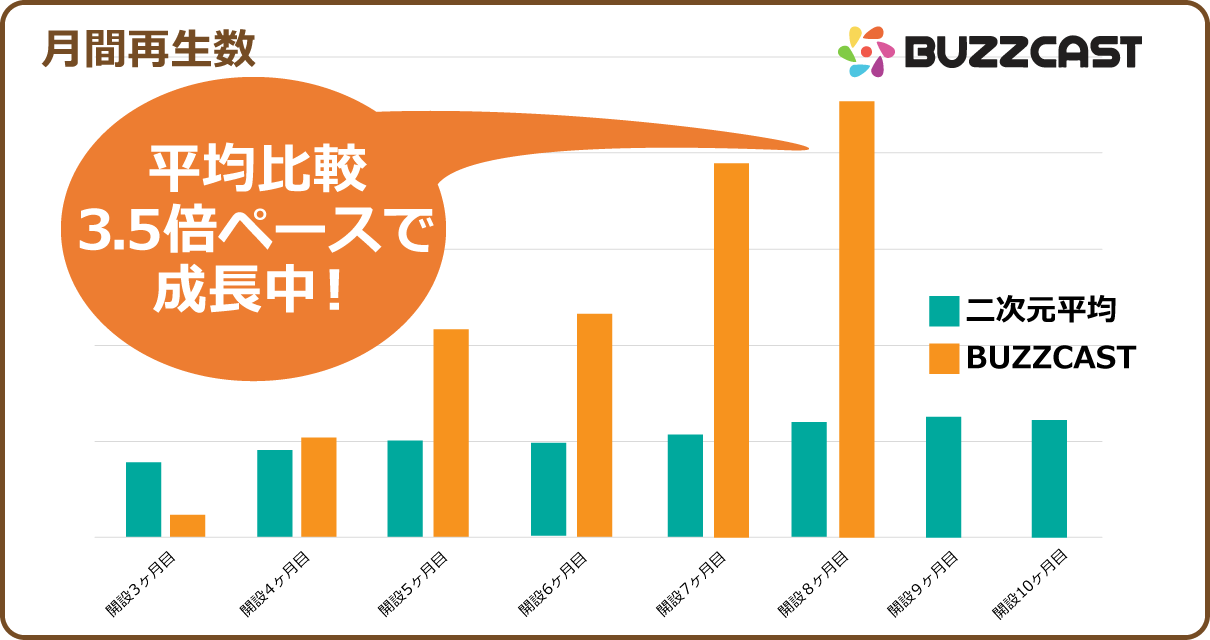 BUZZCASTでは過去複数のチャンネルを自社開発、運用しており、現在市場平均の3.25倍以上のペースで拡大を続けております。