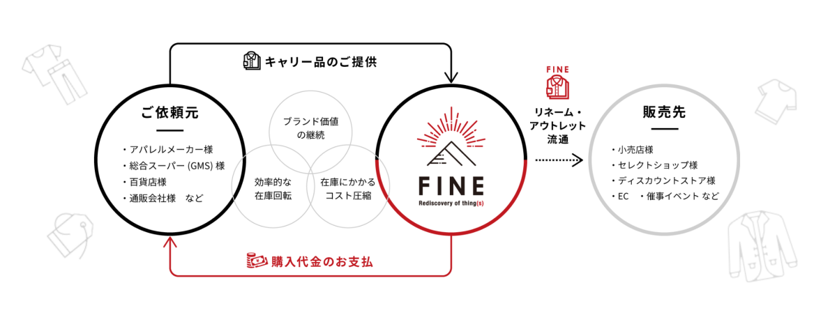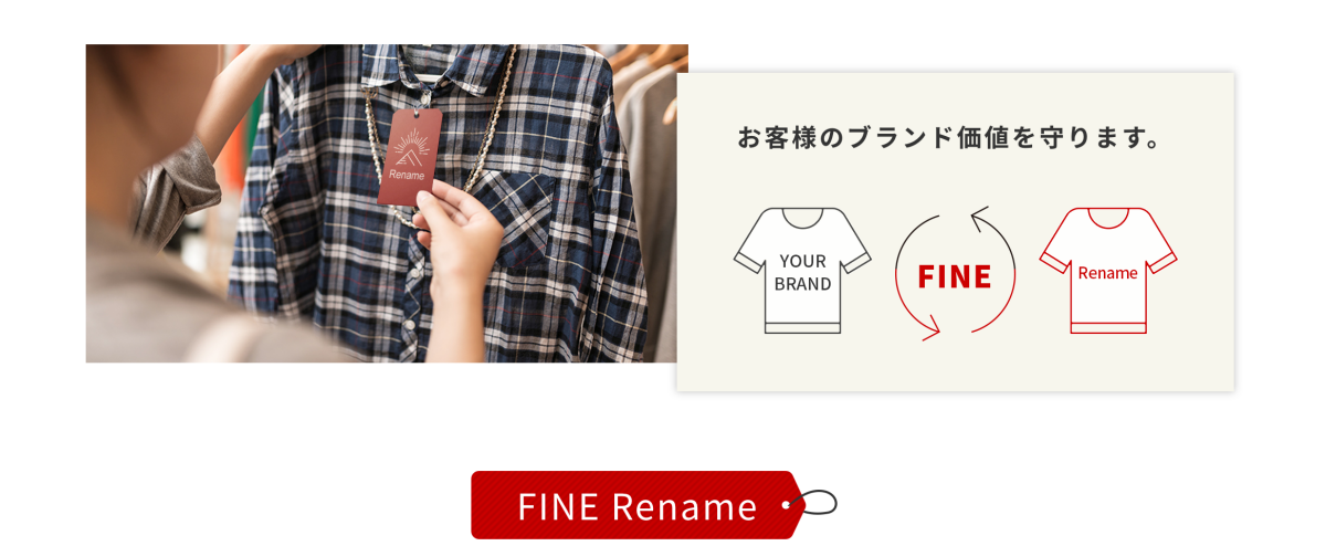 COOの津田です。株式会社FINEでは、ブランドさまやメーカーさまの在庫に対し、ブランドネームタグ(襟ネーム)や洗濯表示タグ(内タグ)などを付け替えて再流通する『Rename(リネーム)』事業を展開しています。ブランド名をクローズして流通することで、ブランド価値を毀損することなく、在庫の換価や廃棄コストの圧縮が可能です。これまでとは違う顧客層へも商品価値を提供できる、新しい流通方法です。