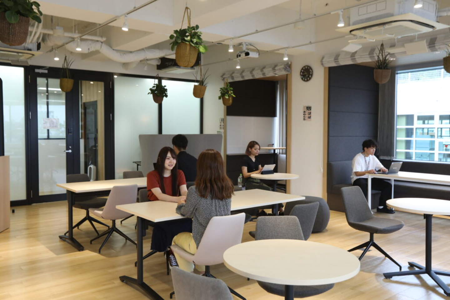来客者が落ち着いてお待ちいただけるスペースです。来客者と社員どちらも利用できるため、簡単なミーティングはここで行います。木々に囲まれた空間のため、気分転換したいときに場所を変えて業務を行うのにぴったりの場所です。