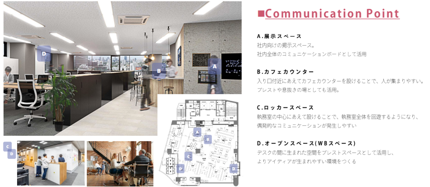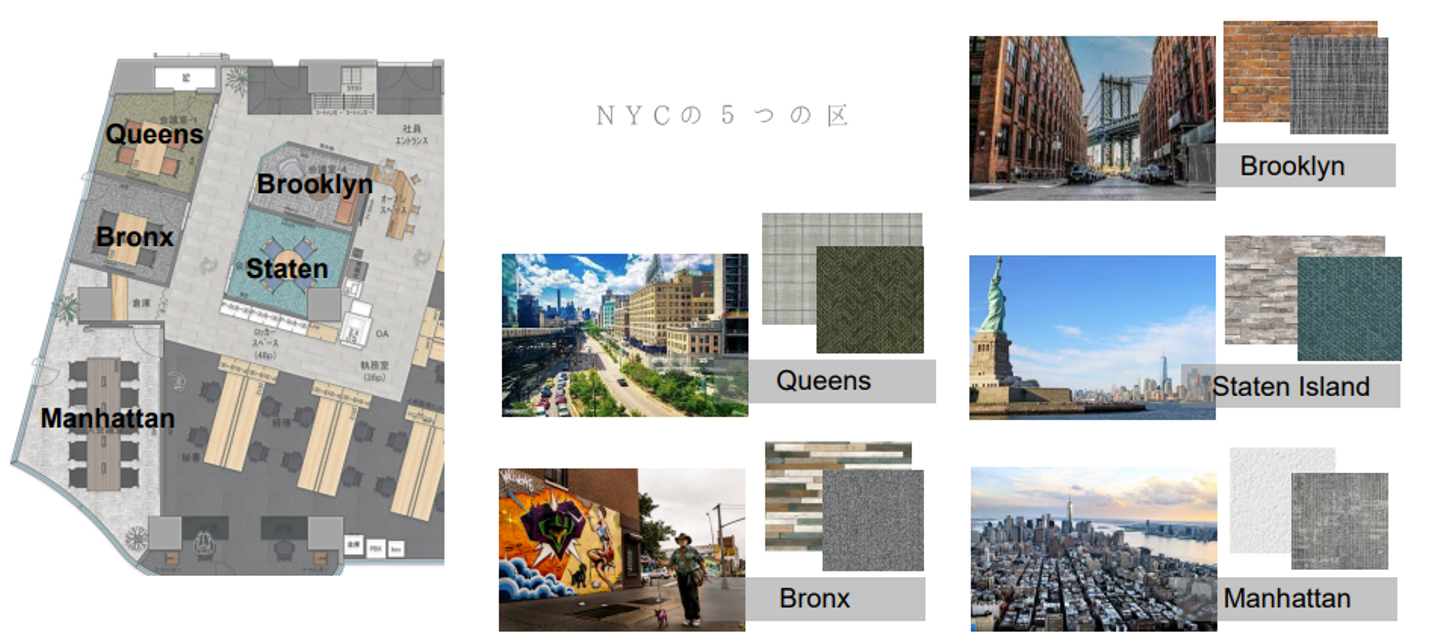 N.Y(New York)には、夢を追いかけ世界中から様々な人が集まってくるように、ネクステージGroupも学歴や肩書に関係なく、夢をあきらめず追いかける人が集まる会社です。そのため、オフィスのいたるところでコミュニケーションが生まれる空間を目指しました。一人一人がパフォーマンスを発揮し、スターの夢を掴む。それを見た人は、次は自分だと夢を追いかけN.Y.(Next You.)を目指す。そんな想いが込められたオフィス空間を目指しました。