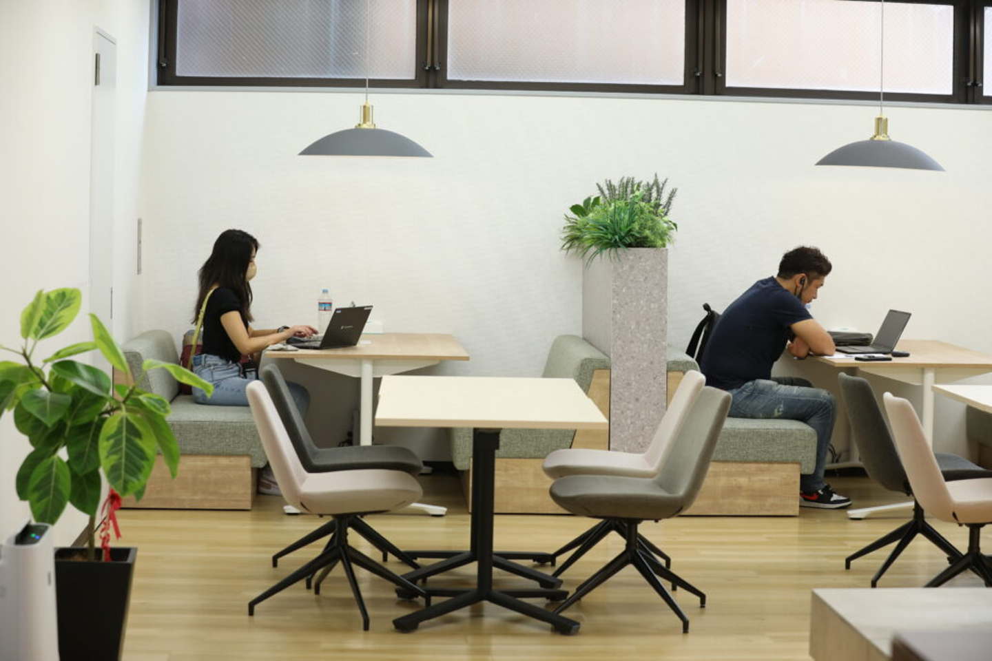 Office2Fは、オープンな執務室となりました。ワンフロアすべてが業務用スペースで開放的になっており、カフェのようなオシャレなスペースや集中して作業ができるデスクが増え、働き方の自由度が広がったため、より雰囲気が明るくなりました。