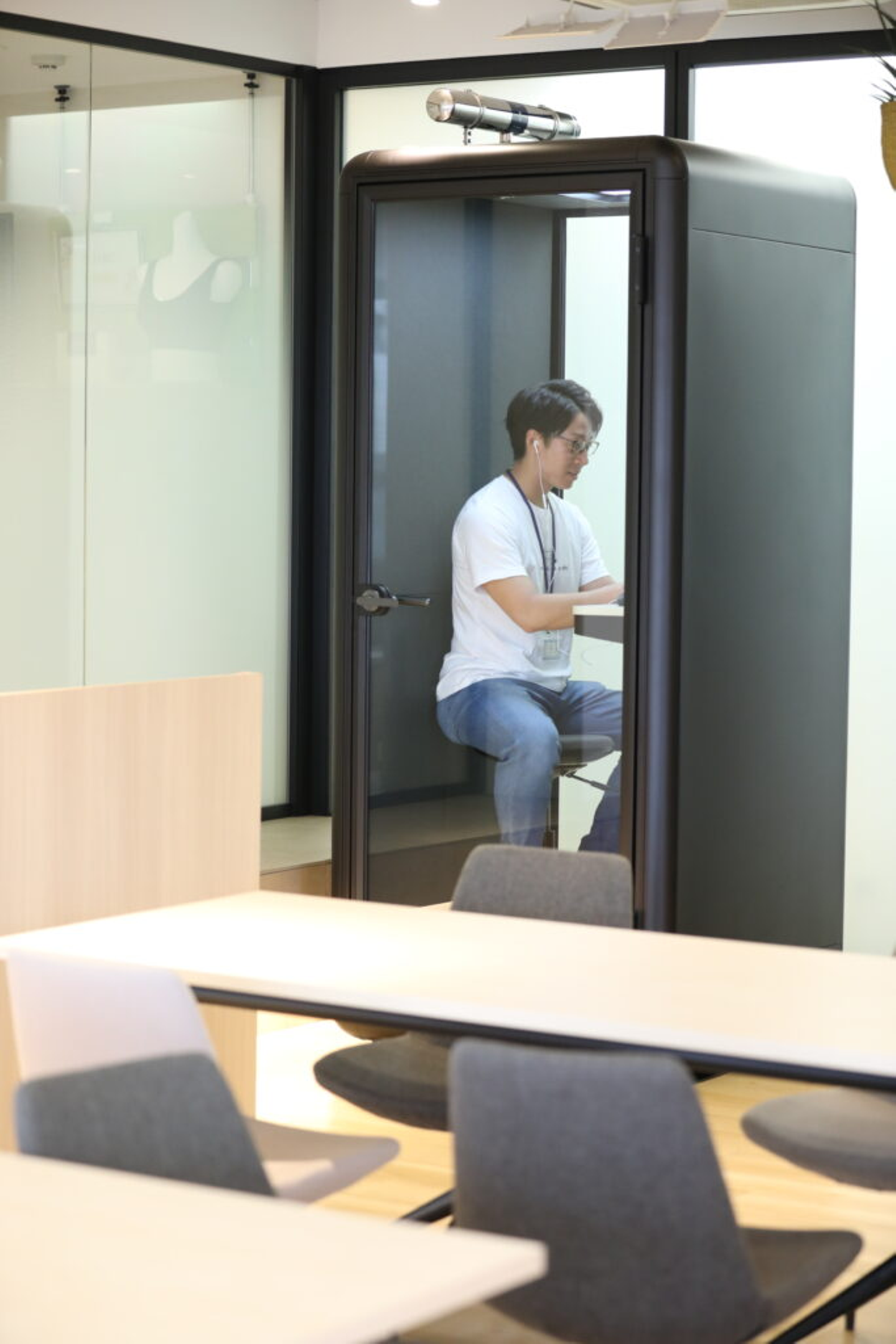 完全防音のTELBoothがお客様との大事な連絡や人事部が面接などを行う際に使用するスペースとなっています。防音性も高いため、中の会話は外に聞こえない構造のため、プロジェクトで大人数が集まって仕事をしていても、TELBoothの空間があればお客様との会話に集中できます。