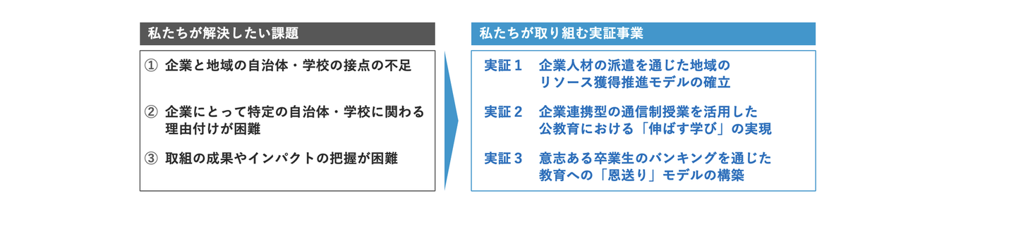 こうした課題認識のもと、弊財団は、以下の3つの実証事業を通じてそれらの解決に努めていきたいと考えています。