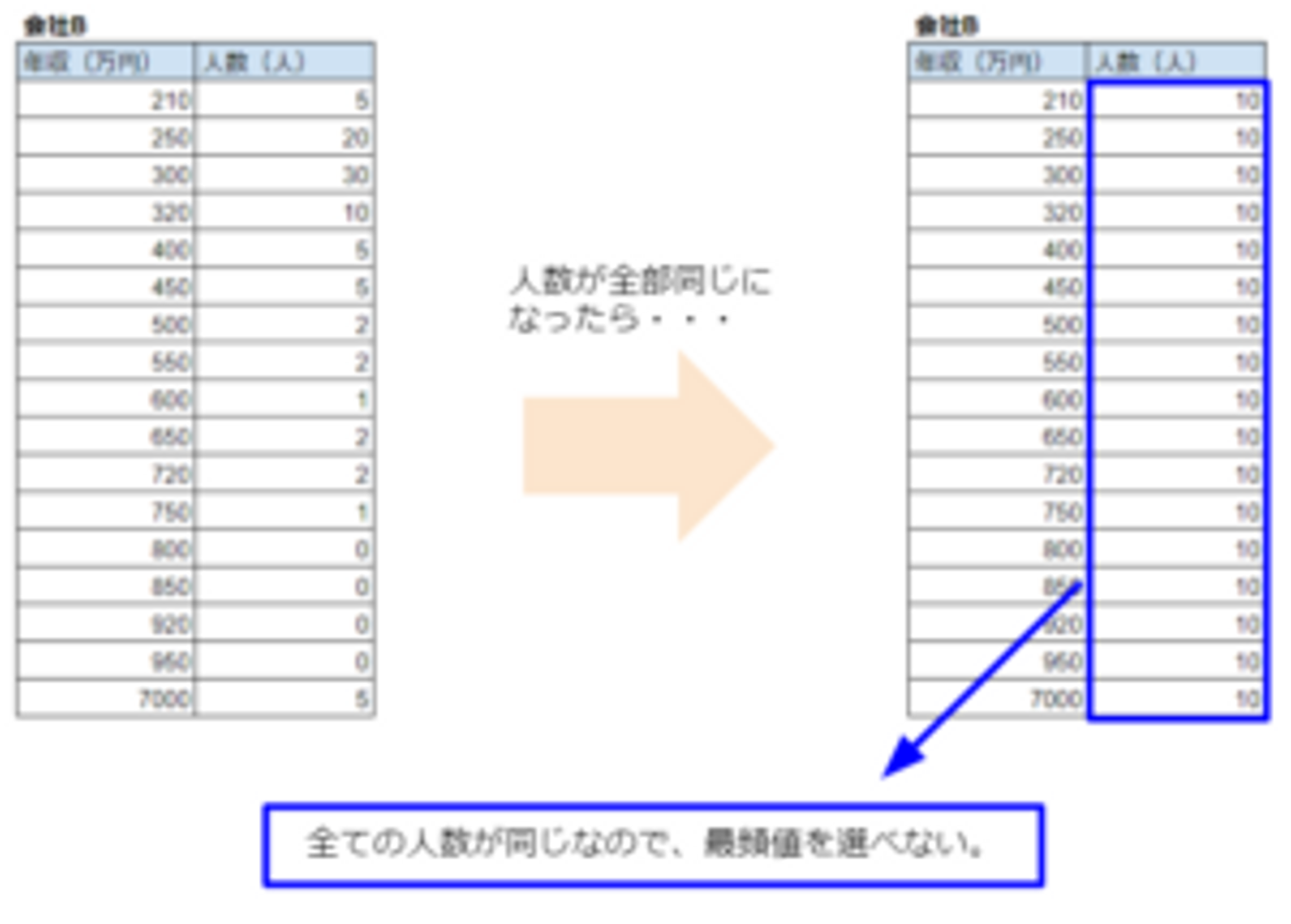 極端な話ですが、会社Aの社員の年収が各金額帯で、同数だった場合は、一番個数が多いものという概念がなくなるので、最頻値という数値の意味を成しません。