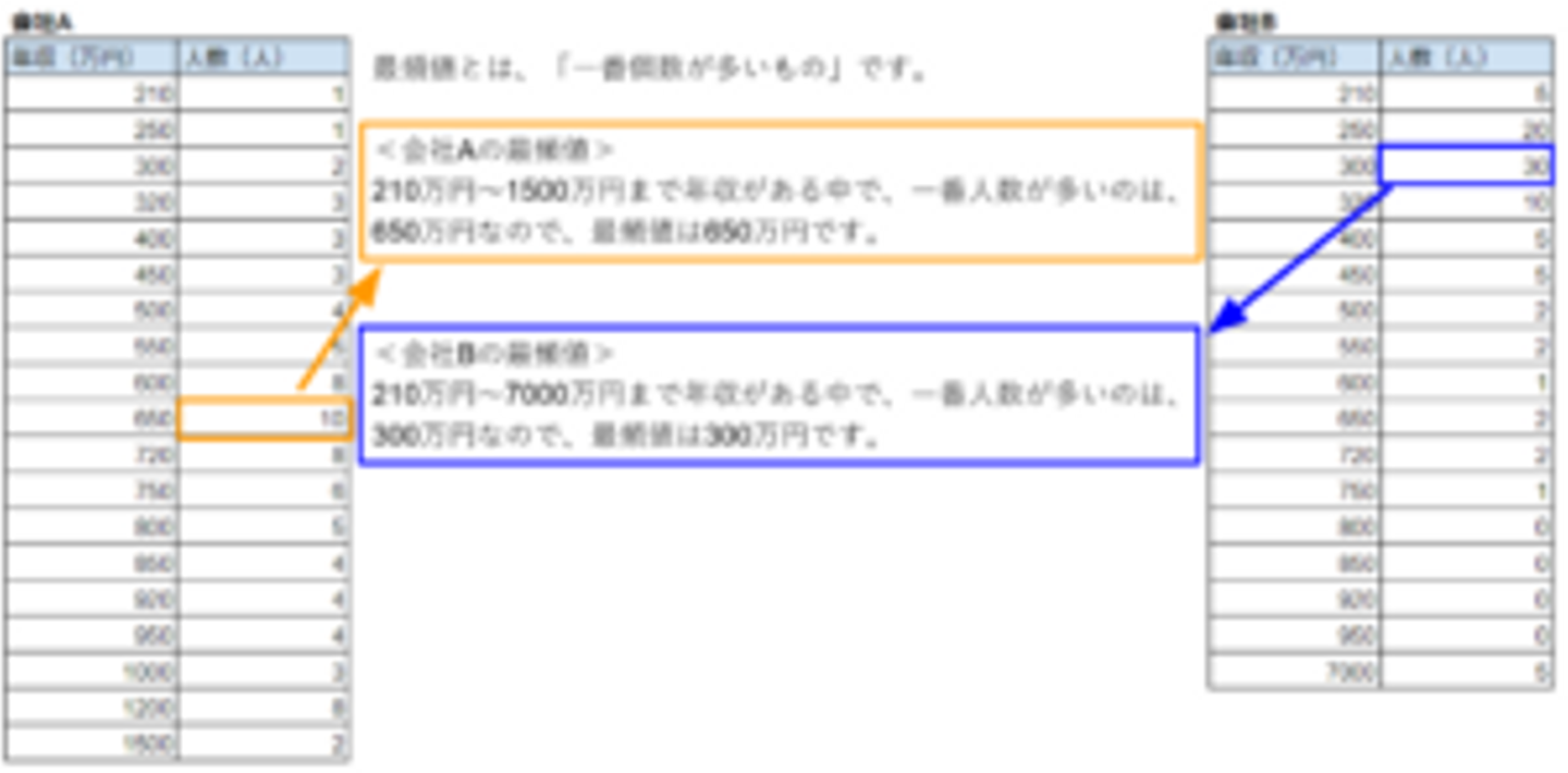 会社Aの最頻値は650万円で、会社Bの最頻値は300万円です。