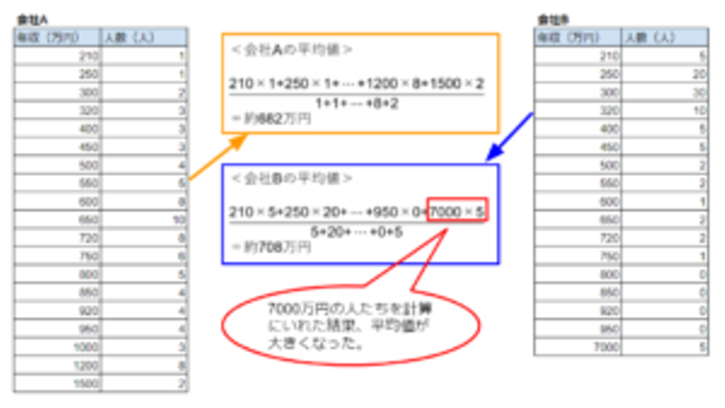 「年収の平均値が、会社Bの方が大きいから、会社Bに入ろう。」と考えませんか。