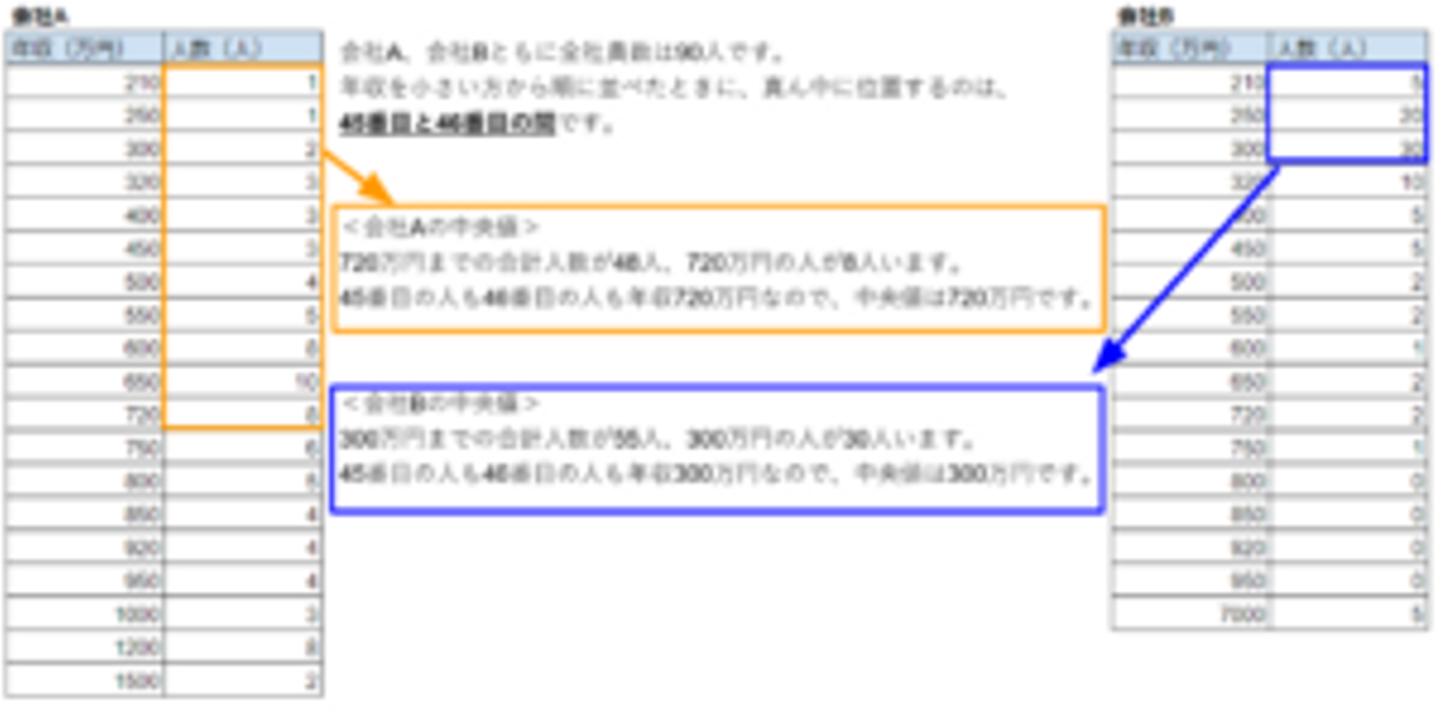 会社Aの年収の中央値は720万円、会社Bの年収の中央値は300万円です。