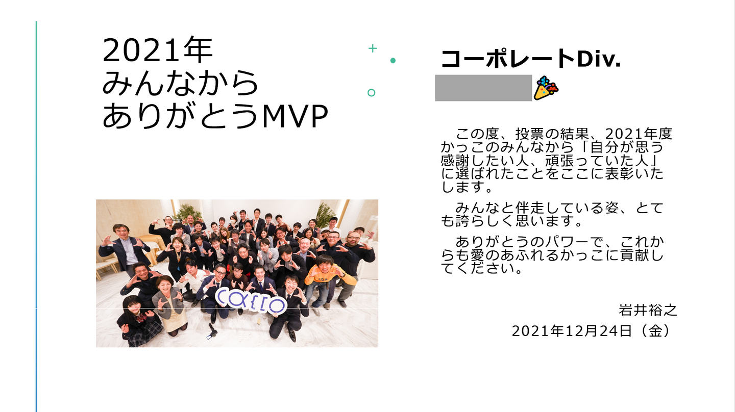 今回初の試みである、岩井さん発案の「2021年みんなからありがとうMVP」の発表もありました!