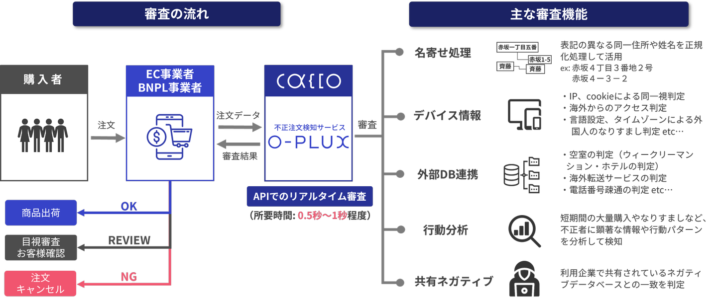 不正対策のコンサルティングを行う中で、EC事業者は不正対策のための運用負荷が高く、審査の仕組みをシステム化したらニーズがあるのではないか、というアイデアがあり、プロダクト化の計画進めました。また、そのタイミングで決済システムのコンサルティングを行っていたお客様に不正注文検知のシステムの提案をしたところ、提案が受け入れられたことから、O-PLUXの開発を進め、2012年6月にローンチ。