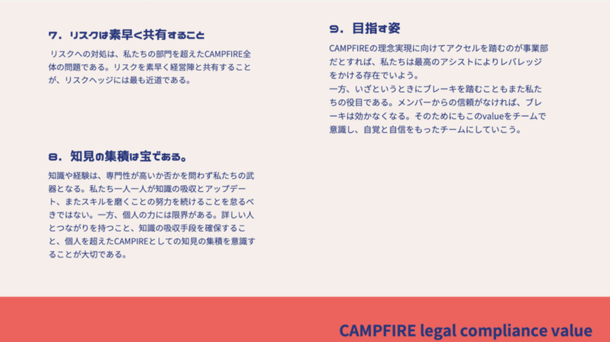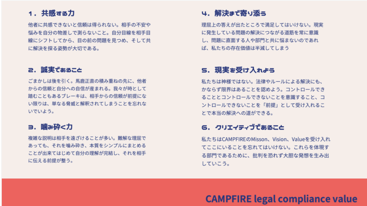 この「共感する力」も含め、法務コンプライアンス部長となった際に、これまでの経験を通じて自身の大切にしたいことを言語化した物がこちらの法務部のバリューです。