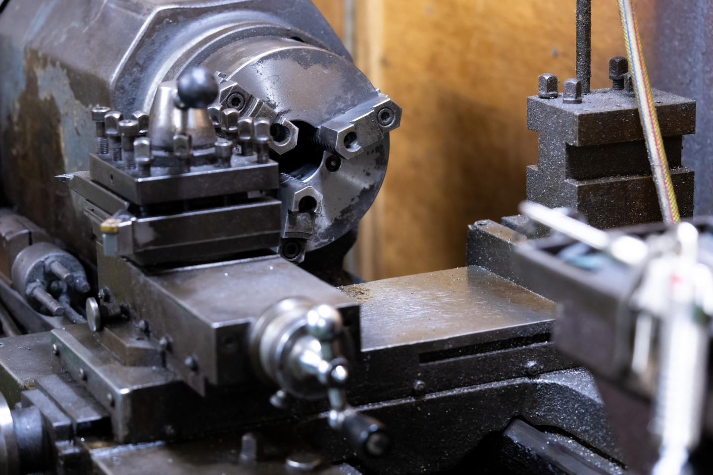 工作機械で行うあらゆる加工方法のなかに「旋盤加工」というものがあるんです。加工対象となるモノを回転させて、そこにバイトと呼ばれる工具をあてて加工する方法で。モノ自体は固定したまま、刃を回転させる「フライス加工」とは、逆の加工方法になるものですね。
