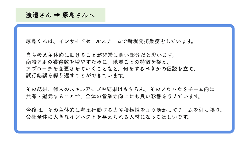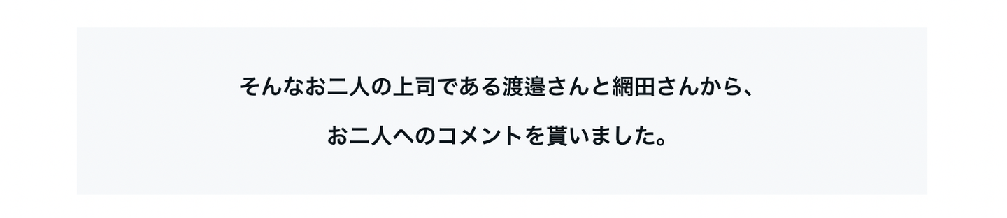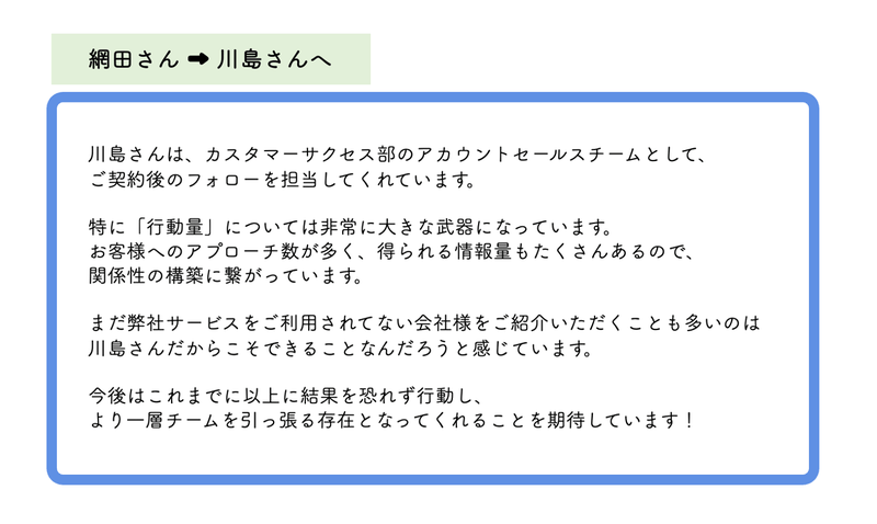 川島:わかる。マサさん(渡邉さんの愛称)は日報のコメントとかもすごく細かく書いてくださって、嬉しいなと思うことがあったんです。日々すごく忙しいだろうに、一人一人の日報にもしっかり目を通してくださっているんだなと。