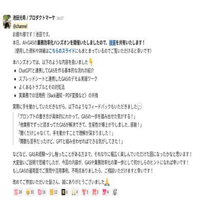 そのほかにも、部署を超え全社向けにAI共有会を開き、自分が試したツール活用や効率化の工夫をシェアする取り組みを行っています。