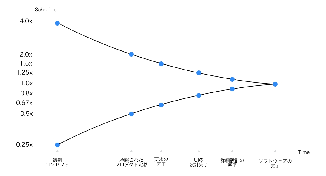 「プロジェクト初期に正確な計画を立てることは困難」ということを意味します。プロジェクトが詳細化され、開発が安定する終盤になるにつれて誤差が収束されていくイメージです。