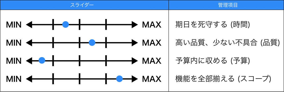 懐かしのアジャイルサムライでは「時間・品質・予算・スコープ」を荒ぶる四天王と表現されていましたが、トレードオフスライダーはこの4つをどういう優先順位で意思決定するかを定める際に用いられるツールです。もともとはインセプションデッキというフレームワークの中の1つのコンテンツですが、それを切り出しています。