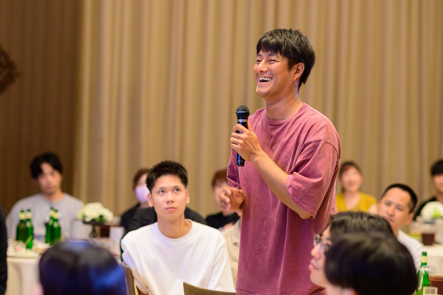 石井さん「5年前は小さい居酒屋で業務委託者を呼んでも10名ちょっとの飲み会だった。創業から3年で潰れる企業が99%というデータもある中で5周年を迎えられたことは素晴らしいと感じている。6期目、更なる飛躍に向けてみんなで一丸となって頑張っていきましょう!」