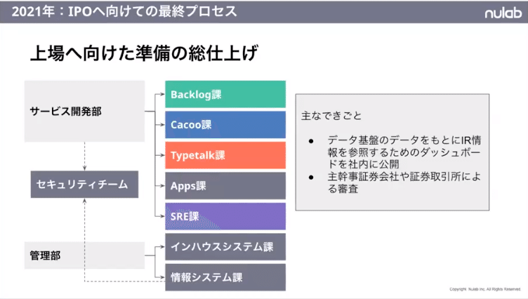 ヌーラボは社内のルールがあまりない自由文化を持つ会社でした。しかし、上場を視野に入れる中で、統制を強化し、ルールを明文化する必要性が増してきました。上場とは別ところでセキュリティの強化の必要性が増してきており、セキュリティの専門チームを設立していました。このチームは、統制の強化にともなうルールの作成や社内教育にも取り組んでくれました。