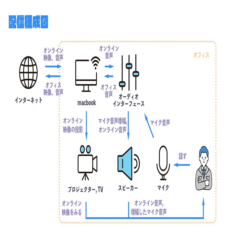 これらの要件から、さまざまな機材と配線、配信構成図等を作りテストを進めていきました。