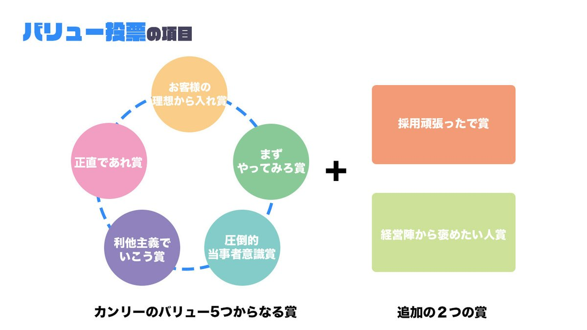 投票の項目は、カンリーの社員が投票し合う5つのバリュー賞と、追加の2つの賞、合計7つの賞でお互いを称え合います。