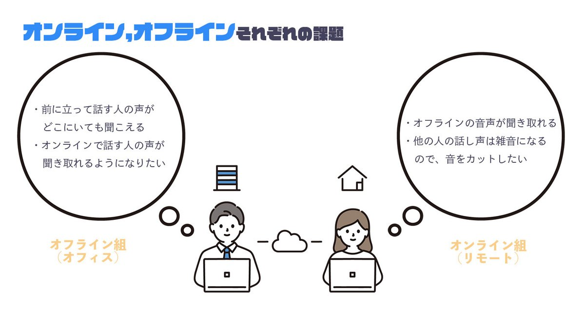 Google Meetに対しては、オフィスで取得したカメラとマイクの音声を流し込み、オフィス側ではマイクの音を増幅し、オンライン側の映像と音声をミックスさせています。