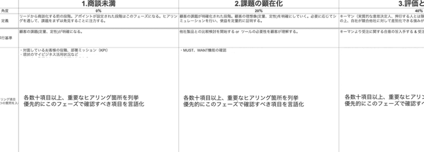 実際の"各商談フェーズの定義と項目”シート(一部抜粋)