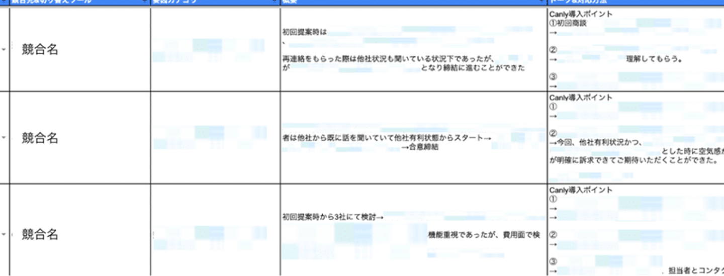 他社比較をして受注した場合のストーリーを言語化し週次で共有(一部抜粋)