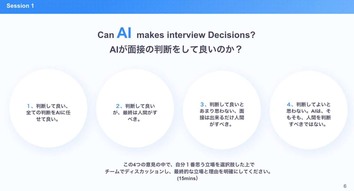 そんな「カンリーAI面接」を題材に、学生たちと思考力を鍛えるディスカッションワークを行いました。