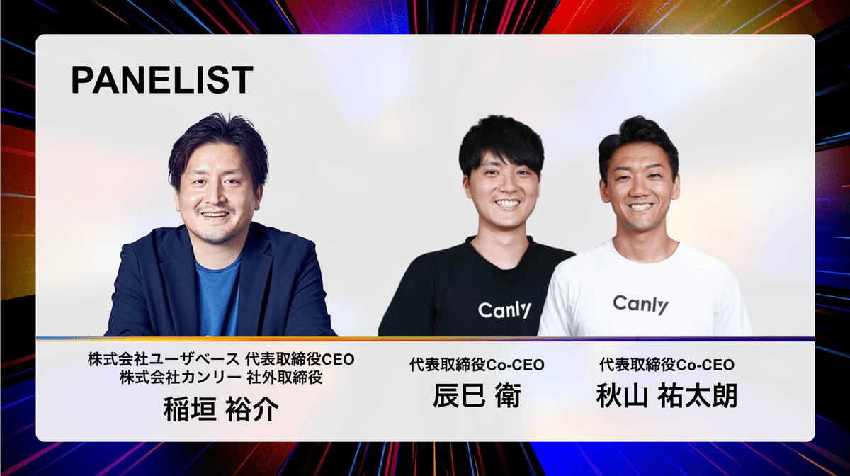 カルチャーセッションには、株式会社ユーザベース 代表取締役CEOであり、カンリーの社外取締役も務めていただいている稲垣氏をお招きし、カンリーの共同代表である辰巳・秋山(本セッションのファシリテーター)とトークセッションをしていただきました。