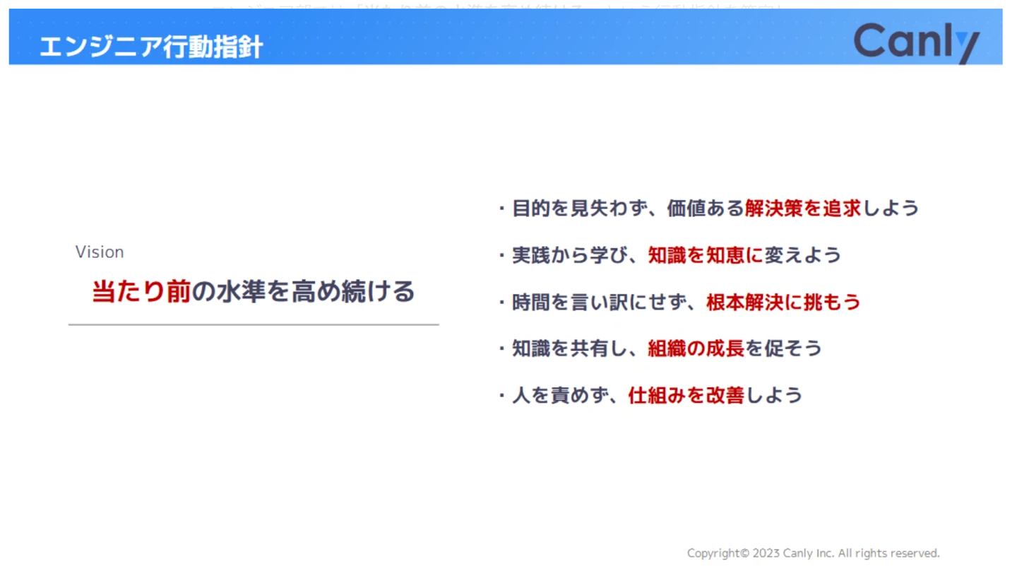 スタンス的なところは、行動指針という形でまとめたのですが、技術力や組織を強くするためには、これを各チームにイネーブリングしていかなくてはなりません。行動指針を体現するってこういうことですよ、という姿勢を見せていくという感じですね。