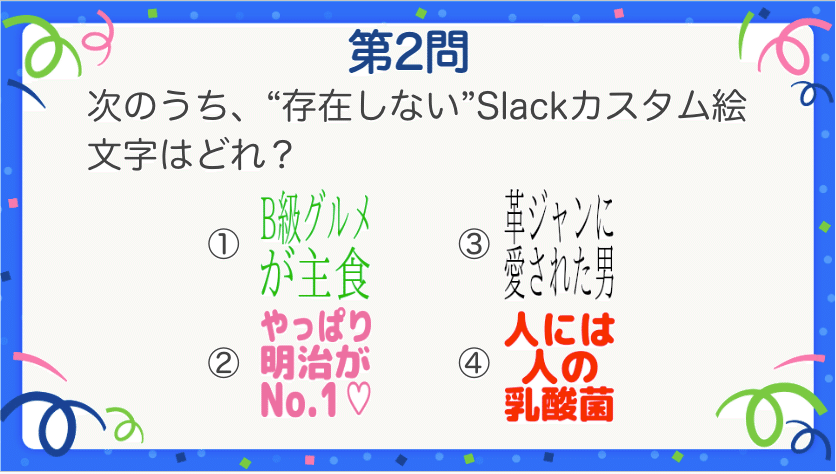 クイズの内容は天王洲に関するローカル問題から、Slackのカスタムスタンプに関する“超マニアックなネタ”まで(笑)出題が続きます。