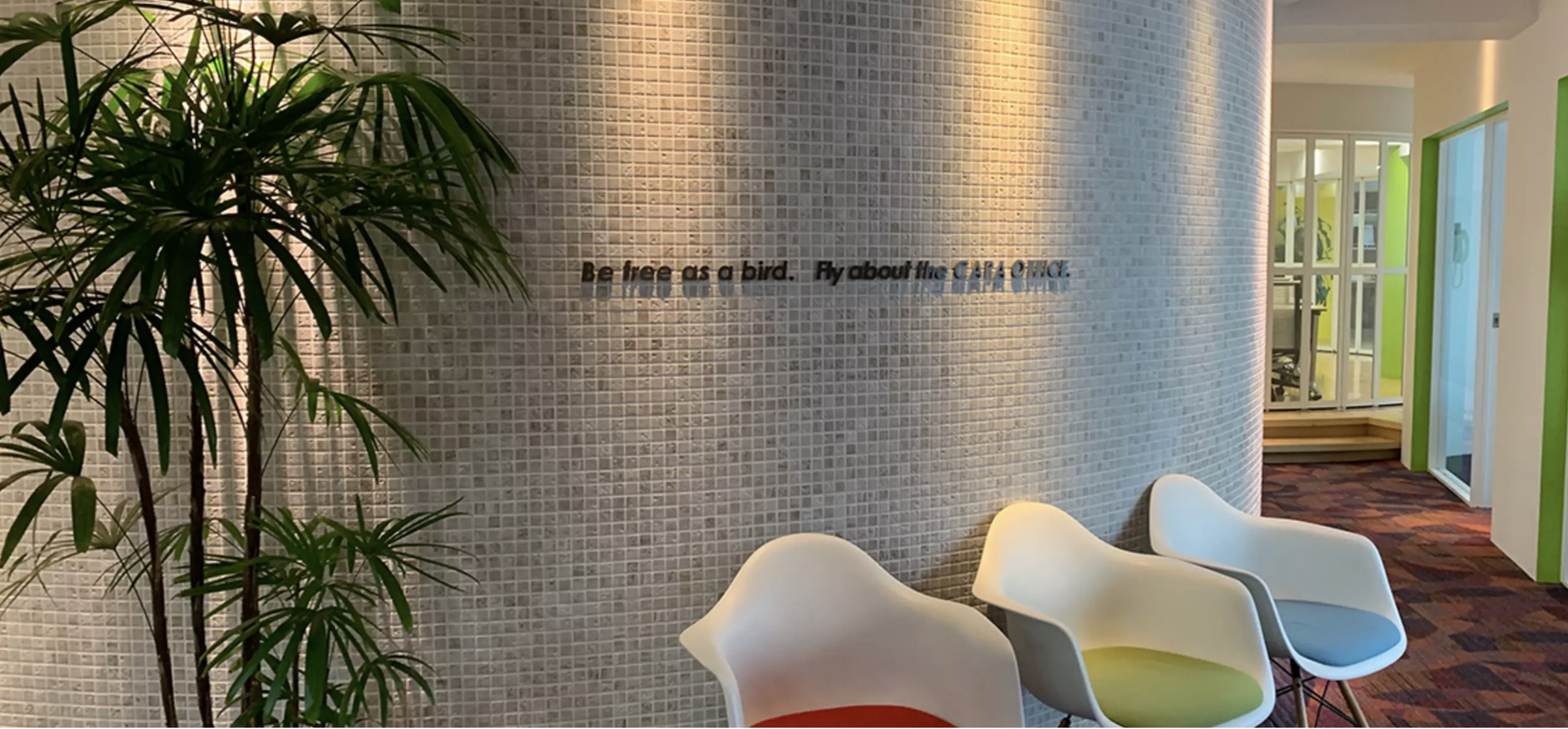 キャパオフィスはビルの2F,7F,8Fです。(8Fは貸し会議室として貸し出しを行なっています。)エレベーターで2F受付に上がると、ドアを開けたらすぐこの光景です。開放感あるエントランスとなっています。