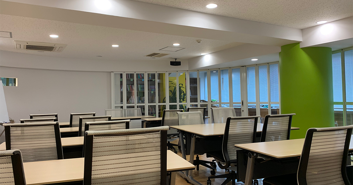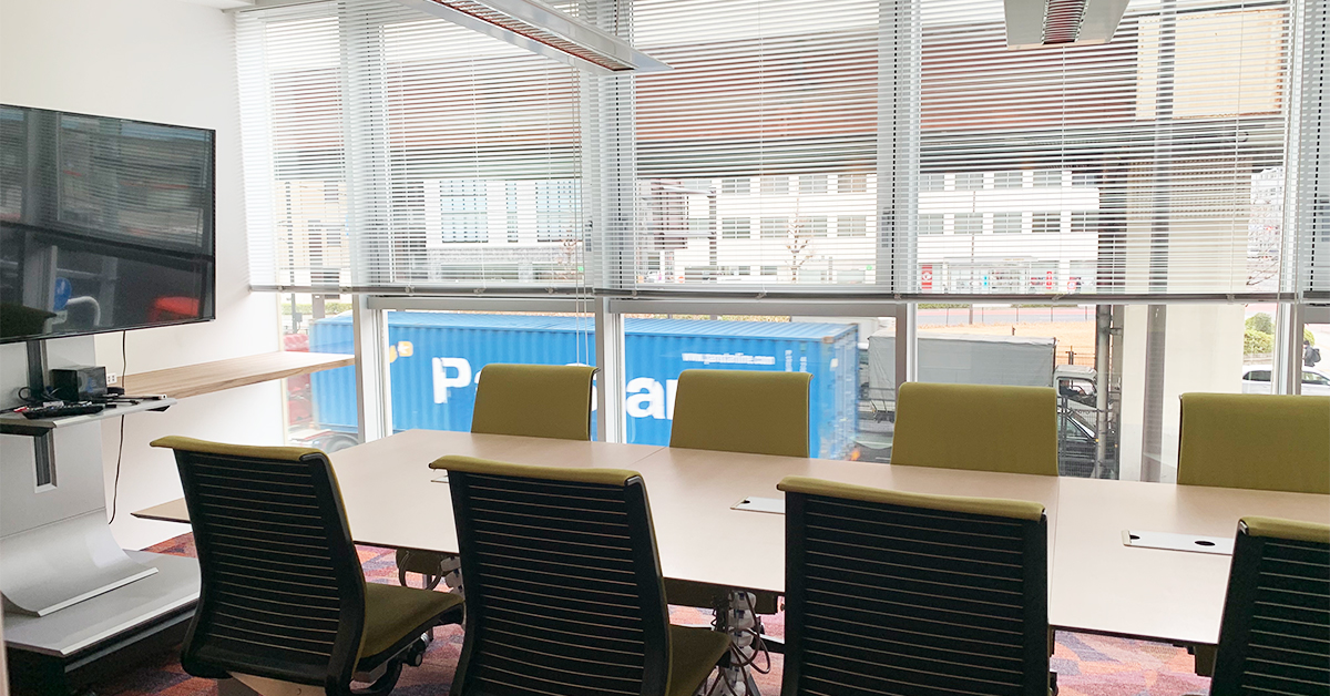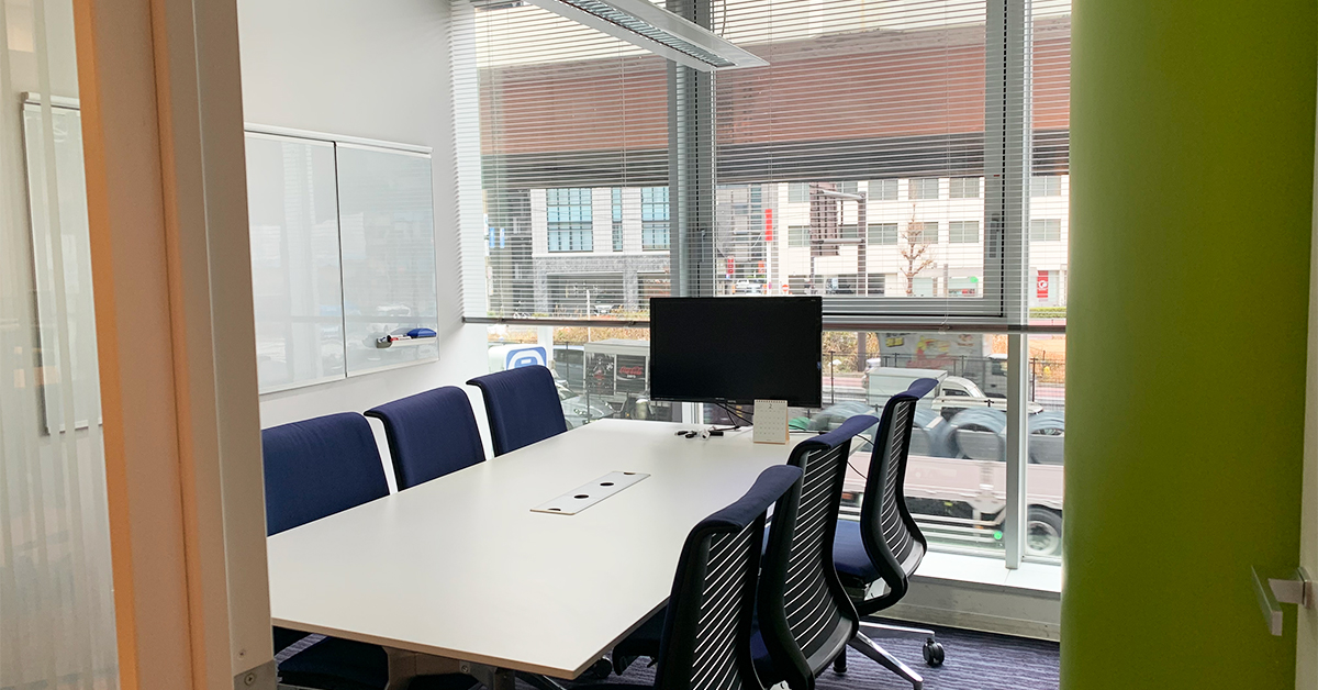2階には、大小合わせて3つの会議室があり、こちらで社内会議や来客対応、面接などを行なっています。どの会議室も外が見渡せて天然光が入る作りになっているので、集中状態を持続させることができるんです。大会議室では、入社式や新人研修を行うこともありますよ。