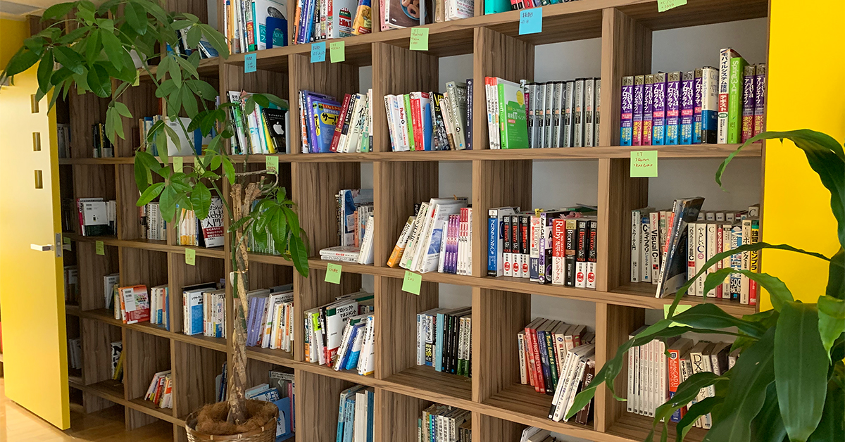 読書家の社長のすすめで、社内には1000冊以上の書籍が用意されています。ビジネス書・技術書・雑誌などなどその種類も豊富です。キャパでは「読書インセンティブ」も用意されているので、社員の学びたいという気持ちを全面的にバックアップしています。この本棚に毎日多くの社員が立ち寄り、お目当ての本を探しています。