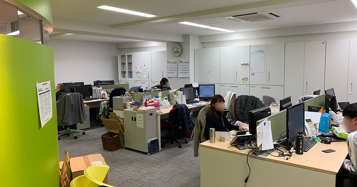 2Fフロアでは、営業部、経営管理室、経営企画室などのバックオフィスメンバーが働いています。全部で10名ほどの少人数ながら、和気あいあいとしたした雰囲気です。こちらでは、時短勤務中のママ社員も2名勤務しています♩