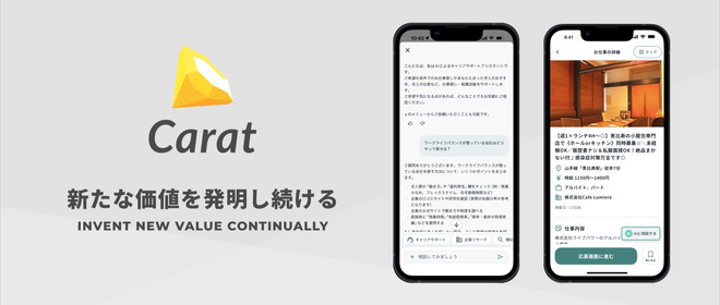 Caratは創業以来、【AI x 仕事探し】の領域にフルベットしています。 注力事業であるAIジョブサーチは、生成AI/LLMを活用し、対話を通じて自然言語による求人検索ができるサービスです。 数百万件の求人情報の中から、AIによる最適な求人提案を受け取ることが可能です。 現在はアルバイト・パートの方々をメインにサービスを提供しておりますが、 今後はAI人材エージェントの実現に向け、正社員や副業といった雇用形態の拡大や、転職相談から内定サポートまで、人材エージェントが担う機能のAI化を目指していきます。