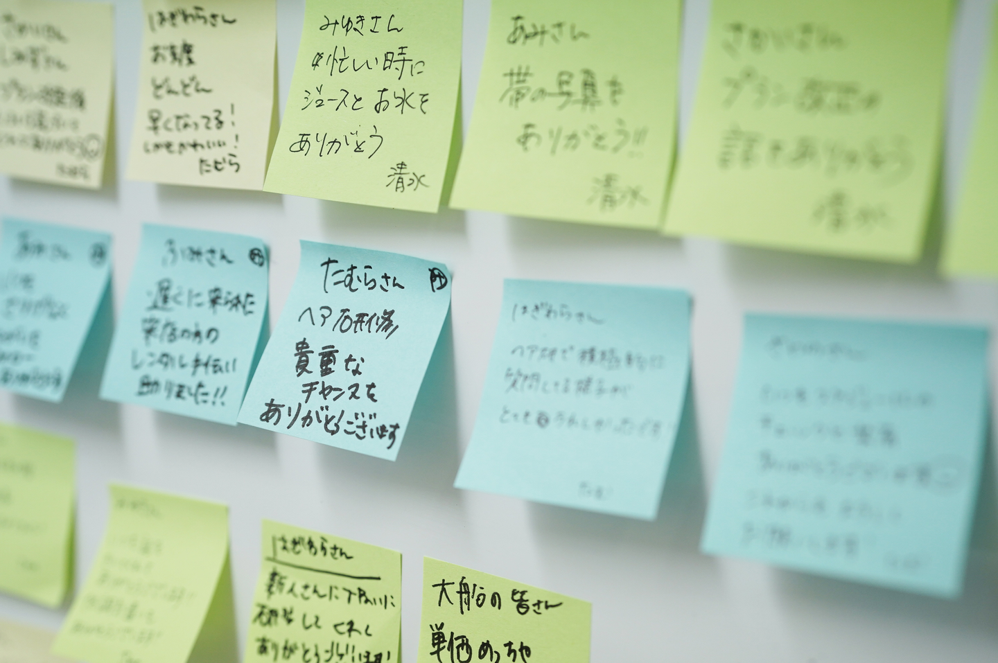 また、コミュニケーションはポジティブな内容を心掛けています。鎌倉大船店独自の取組みなのですが、スタッフルームのホワイトボードに、スタッフ同士のメッセージを付箋でぺたぺた張っているんですよ。忙しくても共有できますし、嬉しいことを書かれると気持ちもポジティブになります。月末にはボードがいっぱいになりますね。