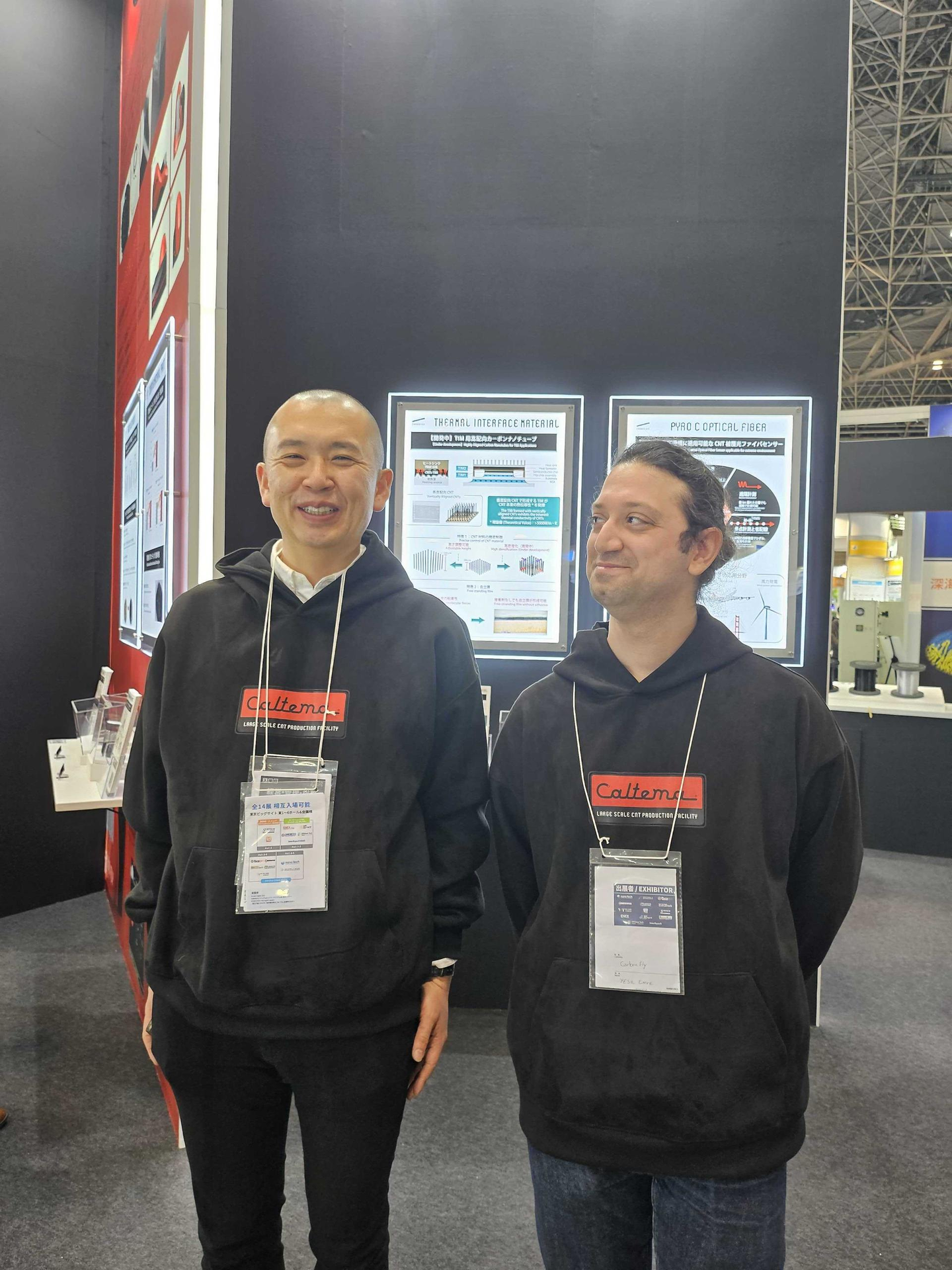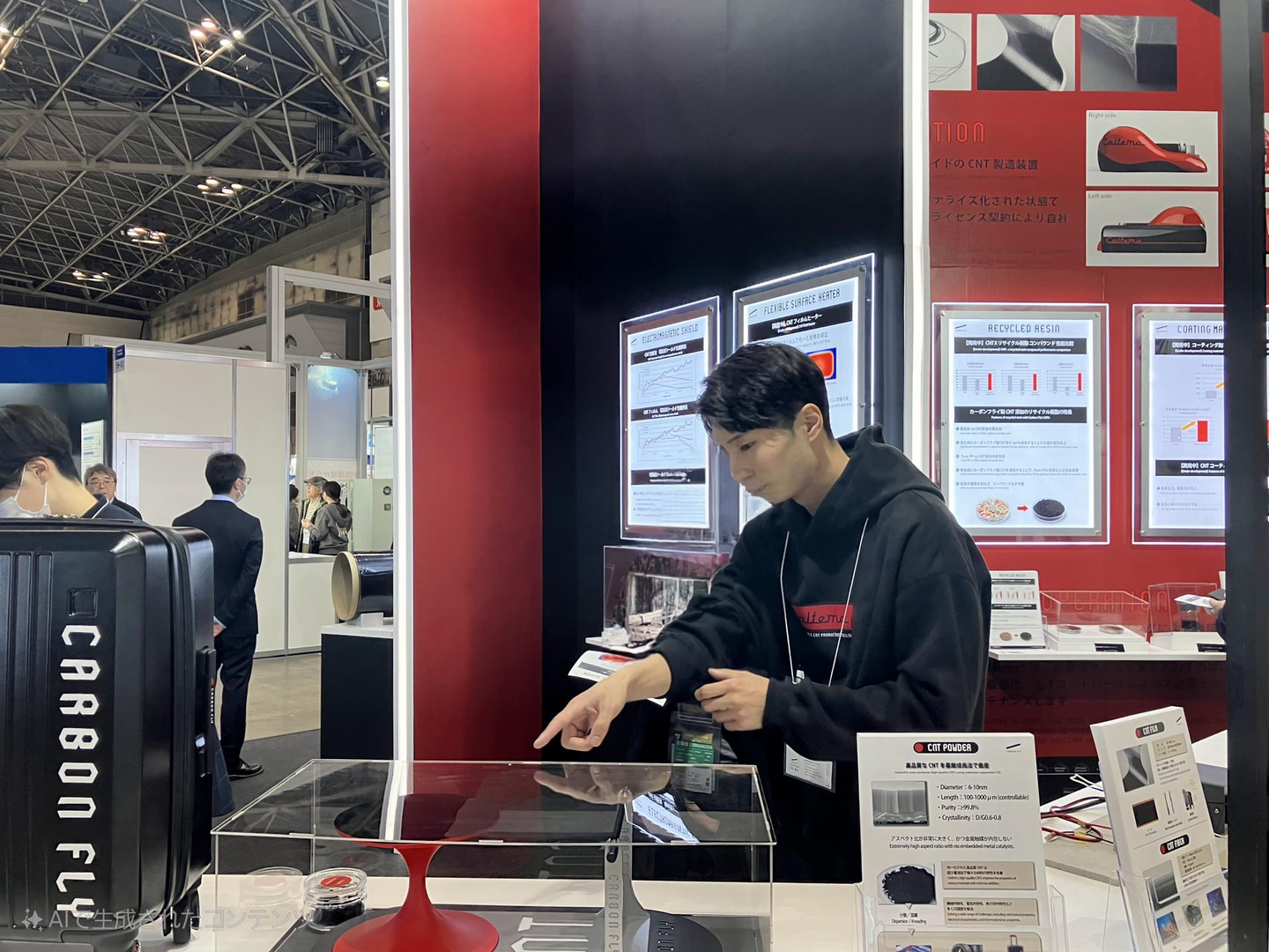 展示ブースは、CNT量産型装置『Caltema®』を象徴する黒と赤のカラーリングで統一し、