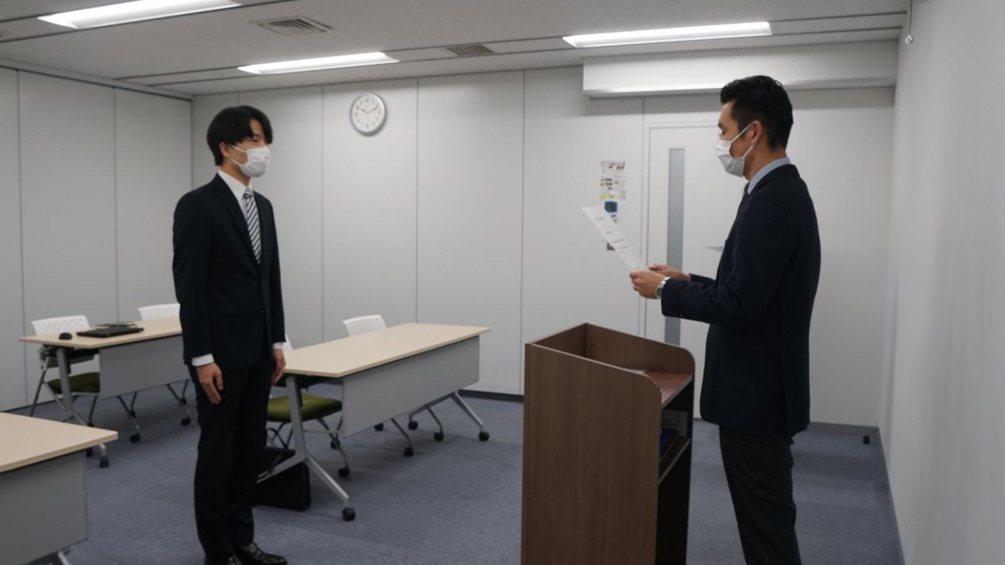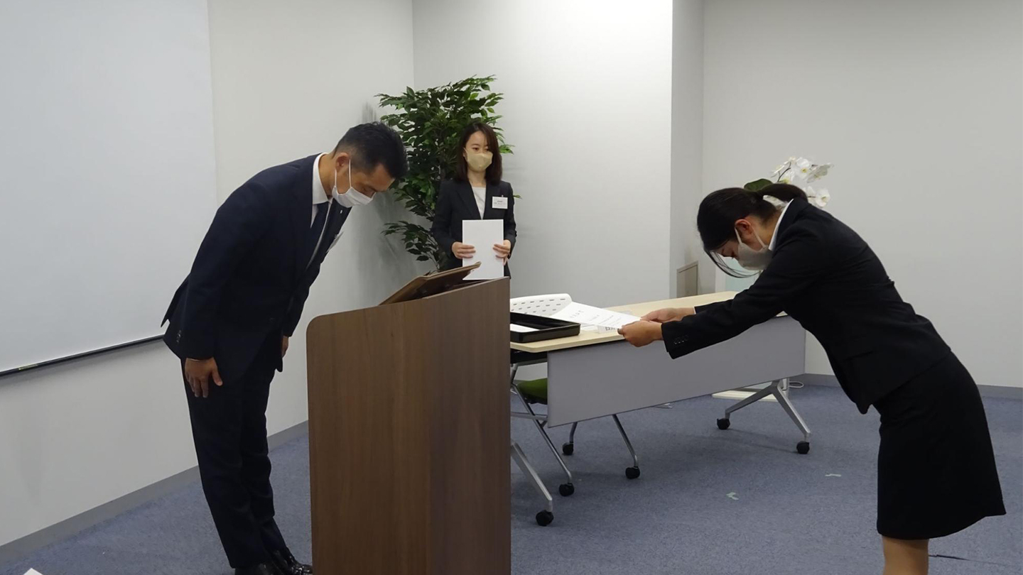 内定証書授与 内定式のメインイベント「内定証書授与」です!内定者ひとりひとりに代表から内定証書が授与されました。当日に参加できなかった内定者が1名おりましたが、その後個別で内定式を行いました!