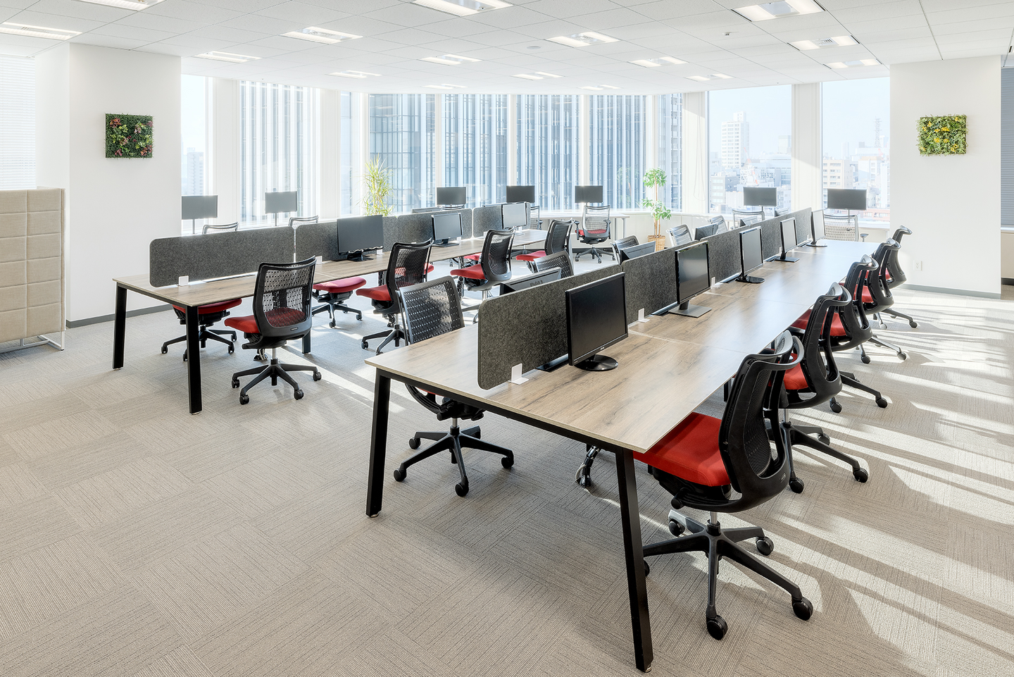 そして1番のメインスペースをご紹介いたします!フリーアドレスなので、その日の気分に合わせて場所を選ぶことができます。デスクの間隔もゆとりがあり、快適空間です♪